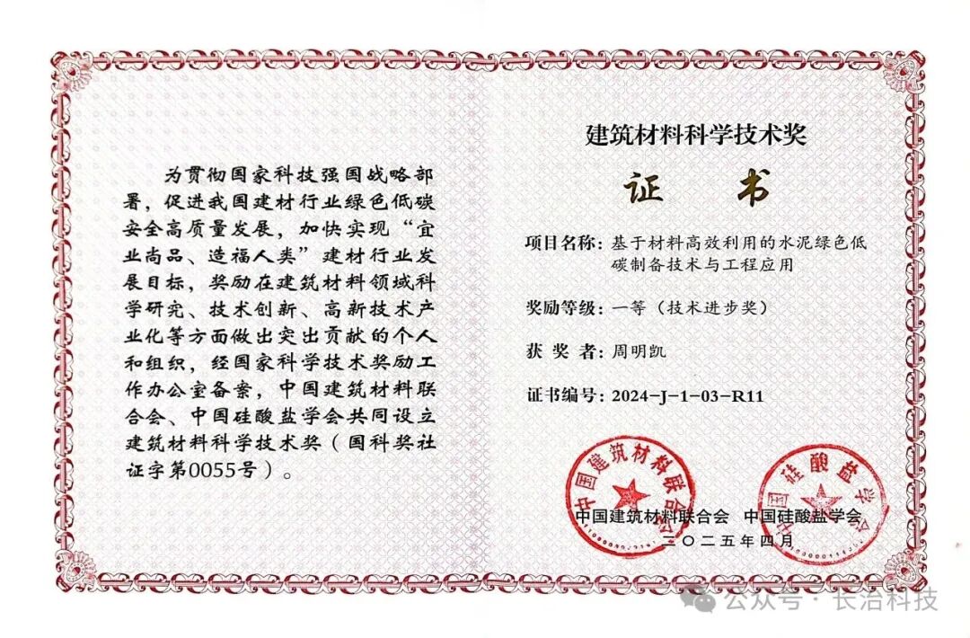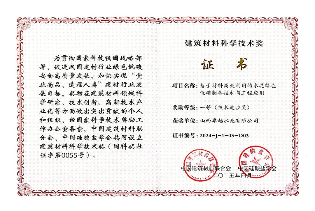 12月3日,在中国建筑材料联合会举行的2024年度建筑材料科学技术奖颁奖大会上,由山西卓越水泥公司和长治市武理工研究院联合华南理工大学共同研发的“基于材料高效利用的水泥绿色低碳制备技术与工程应用”项目荣获技术进步一等奖。该项目是依托山西省煤系固废建材资源化利用技术创新中心这一科技创新平台,由周明凯教授团队历经多年潜心研究、试验和产业化示范应用,取得的一项建筑材料行业重大科技成果,项目整体技术达到了国际领先水平。